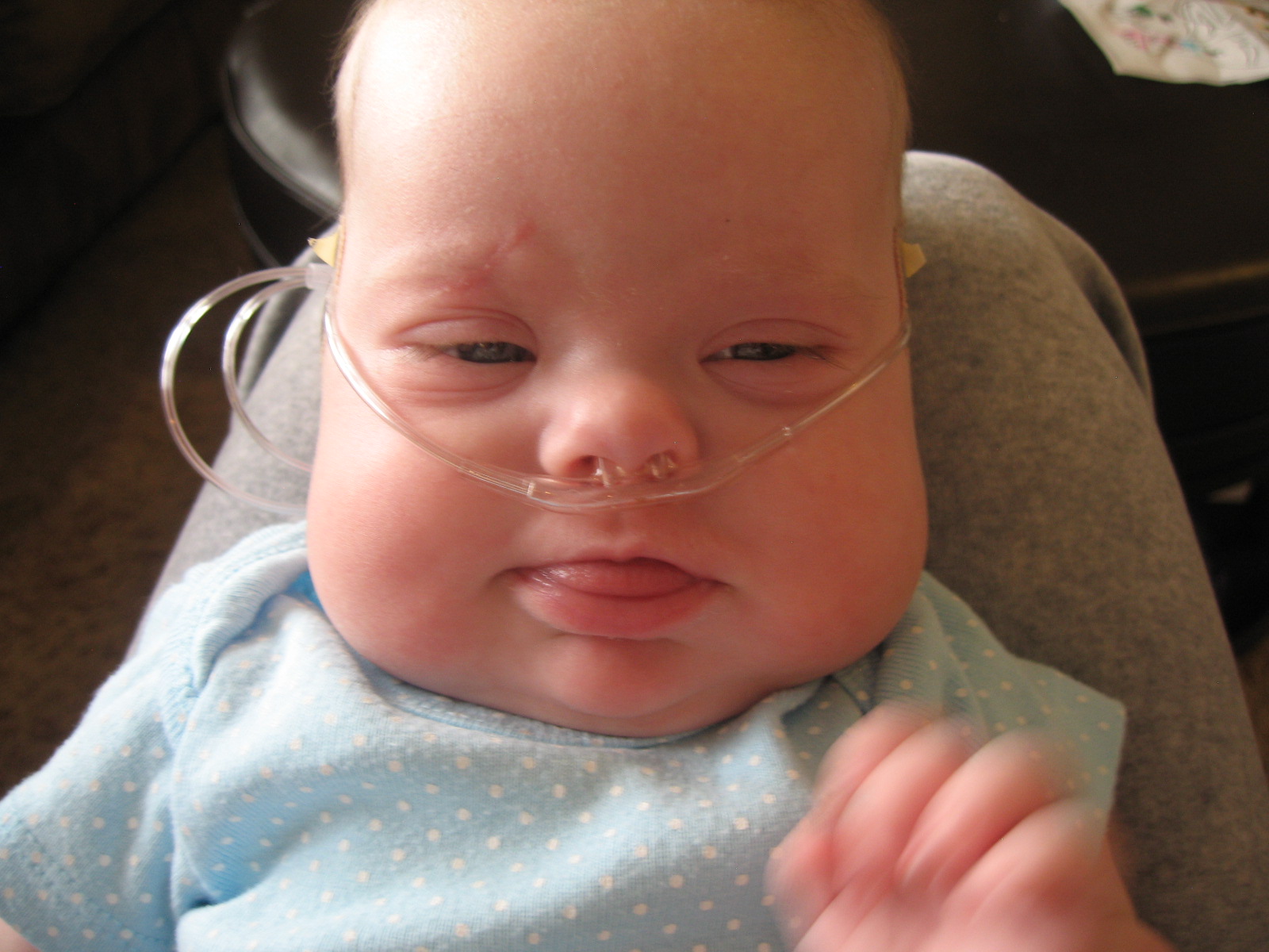 Madi also seems to be so sensitive. It's my understanding that kids with Ds can have a lot of sensory issues. I think she does. Or at least she seems to startle very easy (the Moro reflex). I know this is common in all new babies but she is 3 months old and should be growing out of it. When you look up information about the Moro reflex, it says that if they still have it, it probably isn't the Moro reflex, it's infantile spasms (which, kids with Ds are prone to). Then when you look up that, well......let's just say, don't look up that!