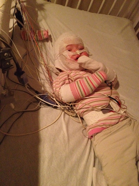 On Tuesday night of this week, I went with Madi to have her sleep study done. She did really well when they were putting on all the wires.......but, once they started wrapping her head......that's when she came completely undone! I haven't seen her cry like that in a loooonnngg time! She was completely hysterical, to the point of not being able to catch her breathe. Poor baby girl!